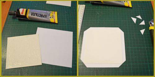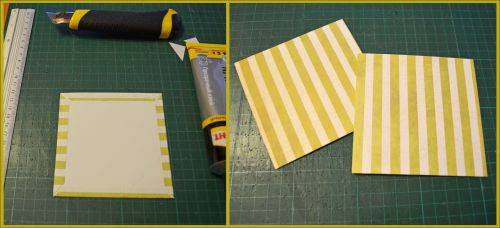 Загибаем лишнюю бумагу и подклеиваем к картону. То же самое проделываем со второй парой и получаем два аккуратных квадратика.