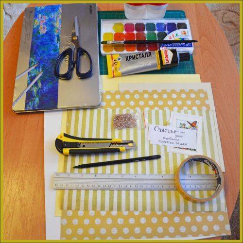 - кисточка, простой карандаш, канцелярский нож, металлическая линейка, ножницы;