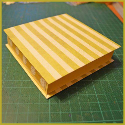 - Крышку промять с помощью линейки через каждый сантиметр, чтобы она приобрела полукруглую форму. По длине она должна быть такой, чтобы немного перекрывала верх передней грани. Если длины не хватает, то ее можно «нарастить» с помощью картона и клея.