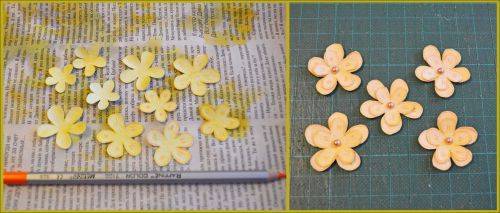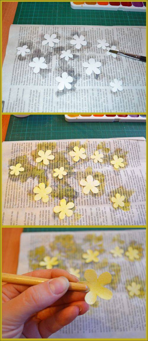 Смачиваем наши цветочки влажной кисточкой. Сразу после этого добавляем цвет по вкусу (насыщенность зависит от вашего желания), а после — придаем форму лепесткам — закручиваем их вокруг карандаша или (как в моем случае) древка кисточки.