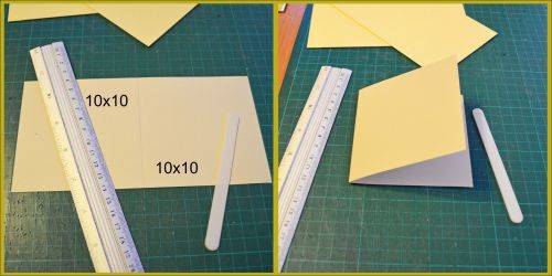 - Далее мы берем самый большой квадрат (18х18 см) и линуем. Следующим шагом будет сделать биговку (наметить места сгибов) — помимо специальной палочки для этого подойдет множество предметов (не пишущая ручка, пластиковая карточка и даже ручка простой чайной ложки). Я же использовала палочку от мороженого. Принцип линовки и биговки показан на фото.