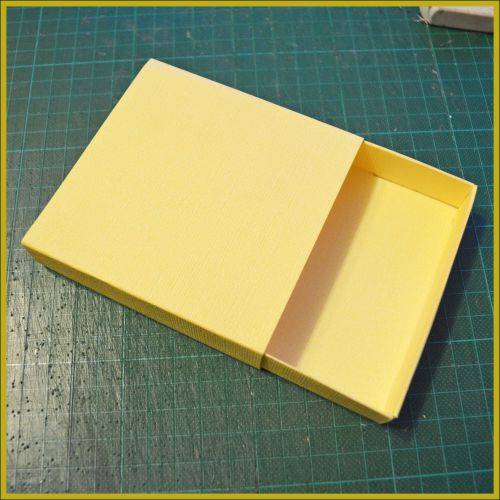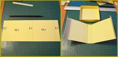 Пора сделать вторую часть нашей коробочки, а для этого мы разлинуем и сделаем биговку на самом большом прямоугольнике картона. Сделать это необходимо так, как показано на фото.