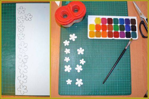 Цветы для украшения подходят замечательно и их не обязательно покупать — можно сделать самим. Нарисуем на изнаночной стороне акварельной бумаги несколько больших цветочков и несколько цветочков поменьше, а затем вырежем.