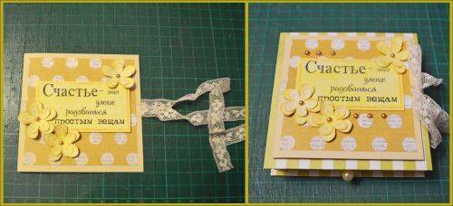 И вот финал: мы закрепляем все декоративные элементы на открытке, а саму открытку приклеиваем к коробочке.