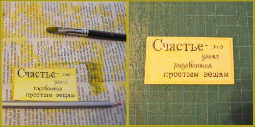 Надпись мы прокрашиваем тонким слоем акварельной краски, по краю обводим карандашом и приклеиваем к картонному прямоугольнику, на 0,5 см большему, чем сама надпись.