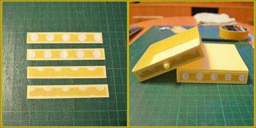 Узкие полосы бумаги (1х9 см) мы наклеиваем их на полосы картона (1,5х9,5). Следующим шагом будет наклеить эти двойные бордюры на коробочку (по 2 шт. на внутреннюю и внешнюю части), а также пришить бусинку, которая будет служить ручкой.