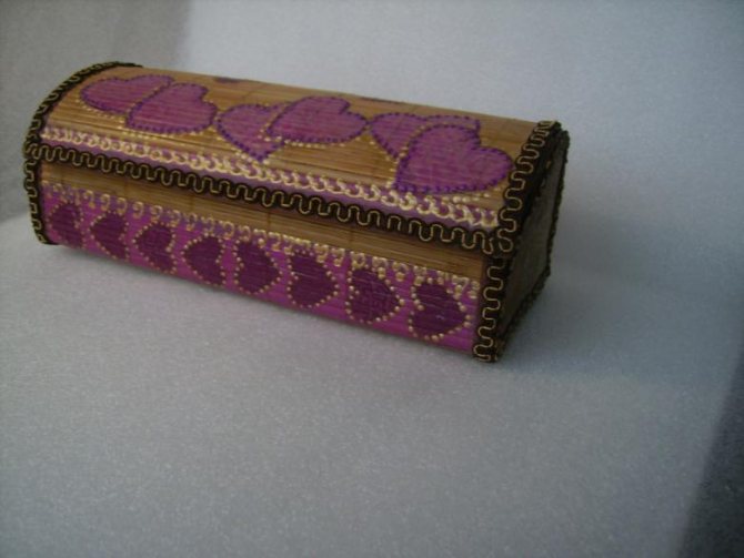 После того, как создали необходимую конструкцию, следует завершающий этап — декор. Здесь необходимо проявить фантазию. Панели по бокам можно украсить лентами или нежным кружевом. Не стоит экономить на дополнительных украшениях, которые подчеркнут торжественность шкатулки. Они подчеркнут внешний вид сундука. Если желаете сделать уникальную шкатулку, украсьте панели сбоку фотографиями молодых.