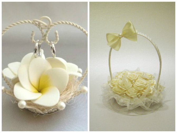 Форма стильного свадебного аксессуара в виде корзиночки с ручкой изысканна и удобна. Эта торжественная деталь изготавливается из ткани, лозы, декорируется летами, бисером, живыми цветами. На дно корзинки с ручками помещаются обручальные перстни. Тематический аксессуар украшают именами жениха и невесты, датой свадьбы, поздравлением, пожеланием счастливой семейной жизни.