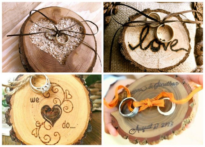 Отличная идея замены классического подноса — это необычный срез дерева. Такую церемониальную подставку украшают памятными надписями, летами, бечевкой, цветами, орнаментами. Дерево на свадебной церемонии символизирует взаимную любовь, семейное счастье, общее начало, преемственность поколений. Подставка, выполненная в виде деревянного среза, станет на вашей свадьбе не только изысканным аксессуаром, но и символом начала новой совместной жизни.