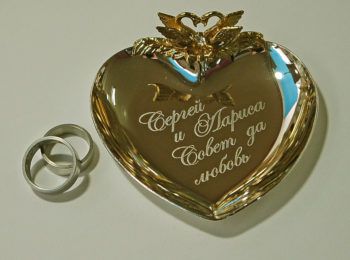 Иногда создают гравировку на дне блюдца, для металлических и стеклянных используют нанесённое изображение, а для керамических хорошо подходит оттиск схематического изображения новобрачных. Часто встречается торжественная надпись или первые буквы имён.