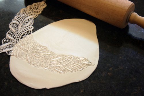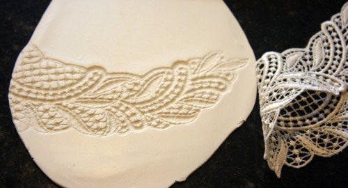 - Приложите к глине кусок красивого кружева. Аккуратно и точно вдавите кружево в пластику.