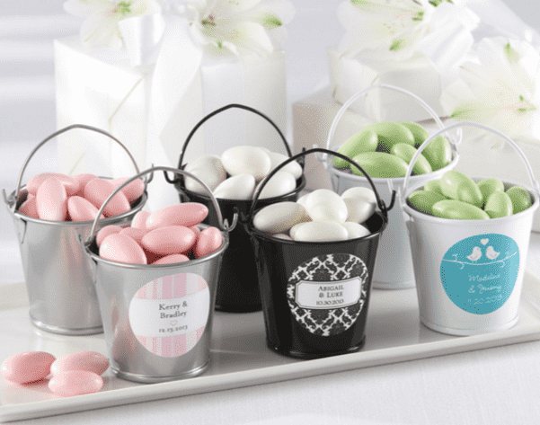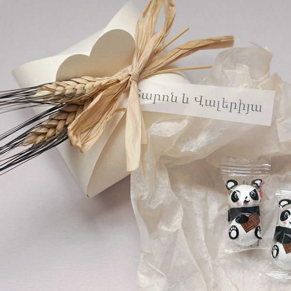 Когда жених и невеста думают, что можно положить в бонбоньерки на свадьбу, их выбор нередко падает на что-то съедобное. В качестве упаковки в этом случае подойдет жестяная баночка или прозрачная пластиковая упаковка. Кроме того, можно использовать плотные пакетики или кулечки, свернутые из декоративной бумаги. Оригинально будут выглядеть бонбоньерки в виде небольших горшочков или корзинок.