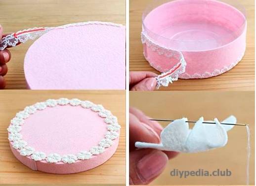 5. Сделайте розочки из ватных дисков и красиво украсьте ими верх крышки.