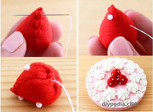 6. В центре торта можно приклеить две-три фетровых клубнички, набитые синтепоном. Как их сделать, также показано на фото ниже.