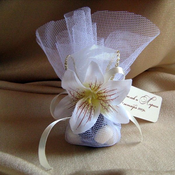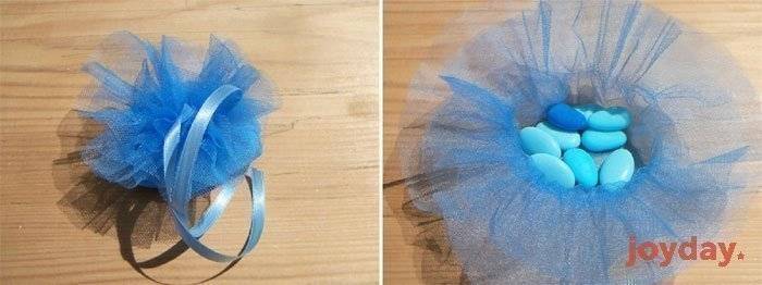 Предлагаем Вам еще один способ изготовления подарочков для гостей своими руками это воздушные бонбоньерки из фатина. Очень легкий и не дорогой вариант, который делается за считанные минуты и выглядит очень красиво.