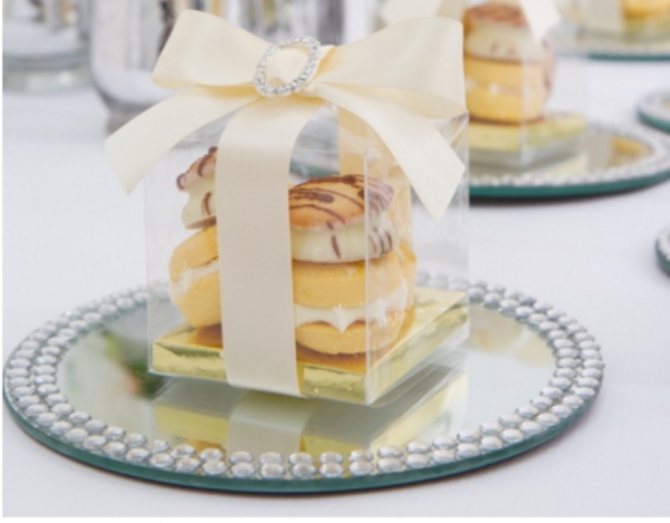 - Пирожные макаруны. Этот популярный десерт можно упаковать в прозрачную пластиковую коробочку или в плотный пакетик. Покупать или печь макаруны нужно за несколько дней до свадьбы, поскольку они быстро портятся;