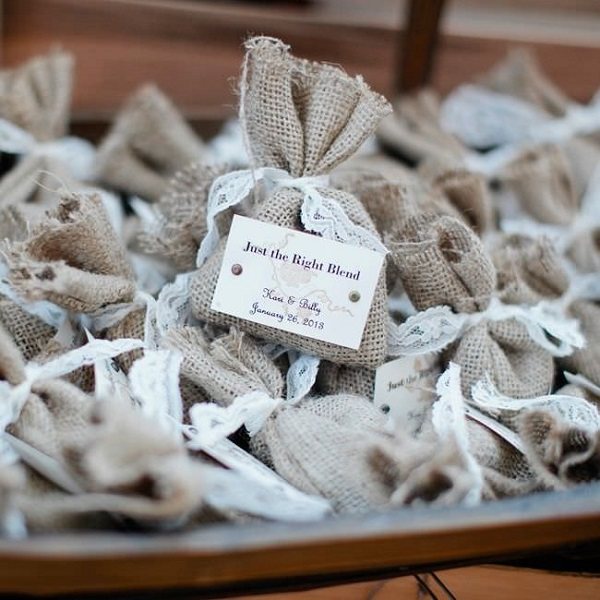 Бонбоньерки могут сочетаться со стилем свадьбы только внешне, в этом случае внимание уделяется украшению коробочки или мешочка. Более оригинальный вариант – полная гармония аксессуара, включая и наполнение, но реализовать такую идею сложнее, поскольку не всегда удается найти нужные мелочи в магазине. Если не знаете, что кладут в бонбоньерки на свадьбу летом, на фото представлен один из подходящих вариантов презента. Чай – универсальный подарок.