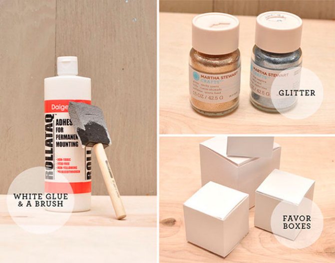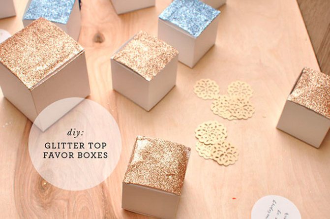 Вам понадобится: белые коробочки, клей, губка, сыпучие блёстки, картон, сладости.