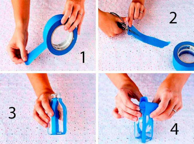 - Обклейте бутылочку полосами, оставляя промежутки с одинаковым расстоянием.