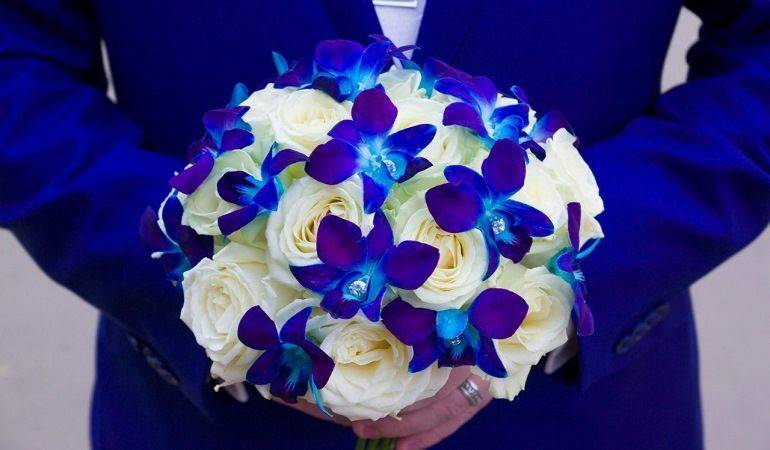 Синий очень динамичный цвет, поэтому он уравновешивается деталями интерьера, оформлением стола, костюмом жениха или его бабочкой или галстуком. Обычно невесты обращаются к флористам для создания букета на бракосочетание, но можно его собрать самостоятельно. Для этого желательно учесть такие правила: