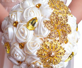 Еще одной модной тенденцией в последние сезоны считается составление букета на свадьбу из брошей, особенно актуально это для композиции золотого оттенка. Можно подобрать самые разнообразные сочетания позолоченных украшений, невеста может дать простор полету своей фантазии. Такой букет можно выполнить в виде сферы или полусферы, дополнить броши можно бусинами, бантами, лентами и другими элементами.