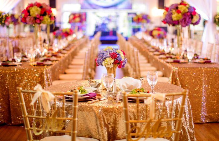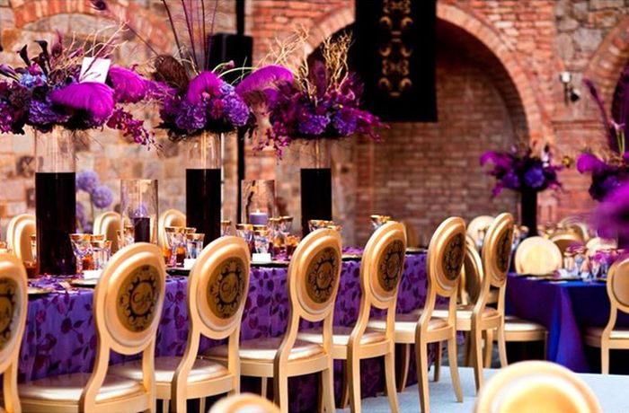 Золото больше всего подходит для свадебных мероприятий, проводимых в дворцовых интерьерах, с которыми они сочетаются естественным образом. Однако можно с лёгкостью вплести золотые акценты практически в любом зале.