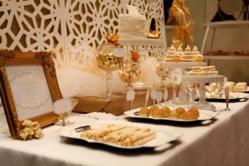 Желательно добавить небольшие декоративные элементы (свечи, салфетки, виньетки, коробки для подарков гостям, бонбоньерки, воздушные шарики, банты). Если используется золотая посуда или столовые приборы, то их следует дополнить салфетками пастельных тонов.