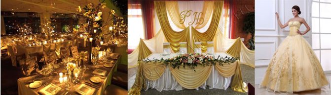 Золотой цвет – идеальное решение для красивой, изысканной свадьбы. Свадьба в золотом цвете всегда выглядит роскошно и богато. Даже если вы ограничены в финансовых средствах, золотой цвет скроет все эти пробелы. Все гости воспримут такую свадьбу, как дорогое и роскошное торжество, организованное в честь молодых.