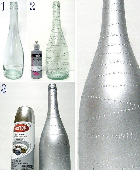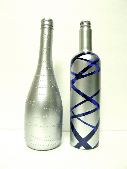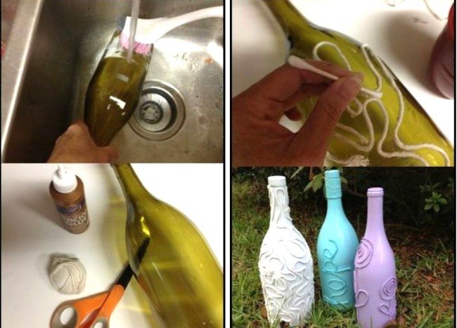 Оригинально получится если перед покраской аккуратно приклеить любую нитку на бутылку. Что бы это сделать максимально точно, лучше всего размещать ее с помощью щипчиков или ушной палочки.