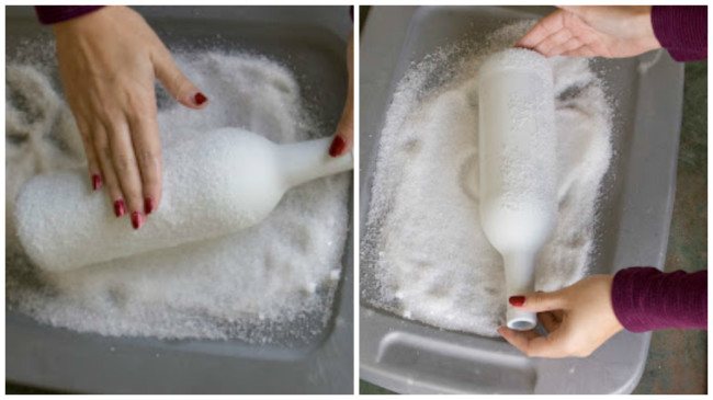 Соль насыпаем в плоскую посуду. Наносим на бутылку клей по горлышко, прокатываем её в посуде и получаем прелестную белоснежную бутылочку!