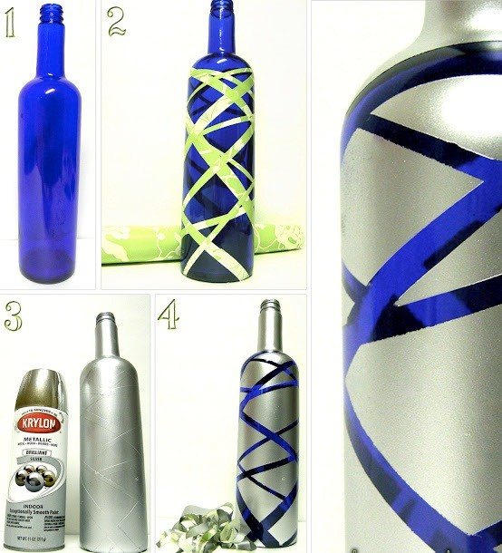 Берем бутылку с цветным стеклом и очищаем её от этикетки. Клеем ленту или бумагу на бутылку так, как захочет ваша фантазия. Обязательно пройдитесь пальцем по наклеенной части, чтобы убрать пузырьки воздуха.