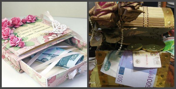 Лучше всего подарить деньги в красивой и оригинальной шкатулке, которая послужит для хранения денег в будущем. Очень актуален такой подарок и тогда, когда в новой семье ожидается пополнение.