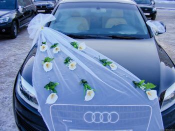 Очень красиво смотрятся атласные ленты на капоте авто, к тому же это очень просто. Что нужно: атласные ленты желаемого цвета, ножницы, цветочные композиции для декора.