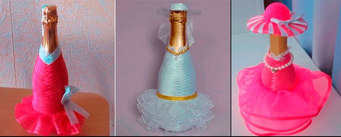Фото того, как можно украсить лентами шампанское на свадьбу своими руками