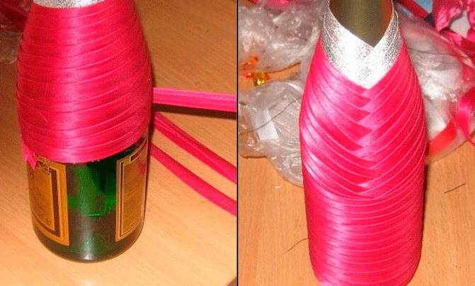 - Приклейте ровными кругами розовую ленту с середины до конца бутылки.