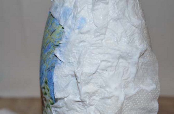 На покрытую клеем поверхность фактурно выложите кусочки туалетной бумаги. Оставьте бутылку просушиться.