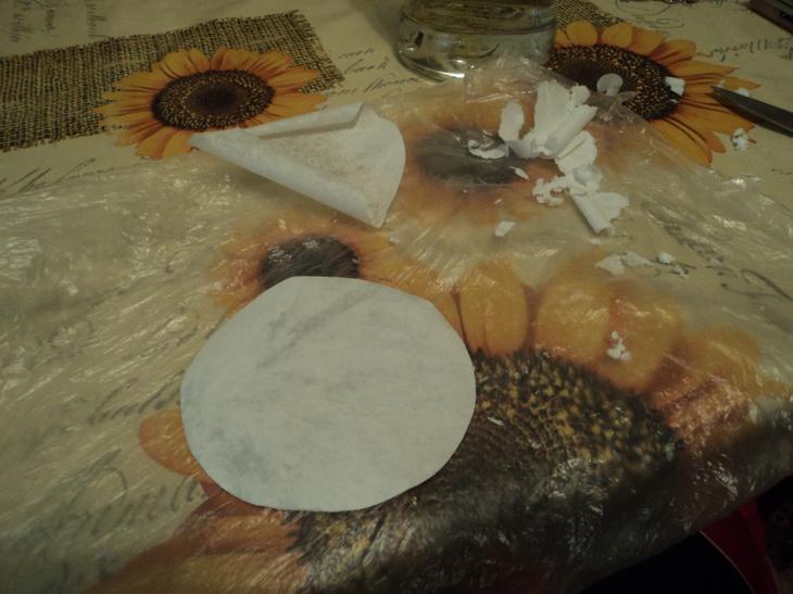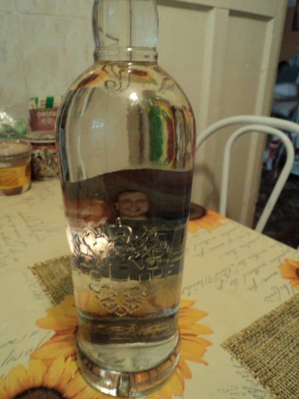 Подготовленную бумагу положить в теплую воду на 3-5 минут (дождаться размягчения верхнего слоя). Затем промокнуть мягкой тряпочкой или полотенцем, скатать нижний слой вручную. В результате останется только верхний слой с изображением, которое и будет переноситься на бутылку.
