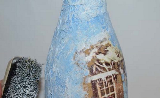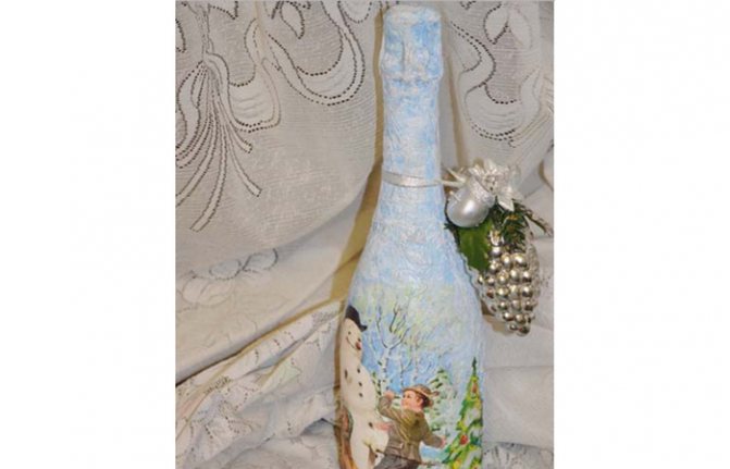 Декорирование бутылки только салфетками даст плоский, лишенный объема декор. Если хочется чего то большего, то едва подсыхающий акрил можно обсыпать крупной солью или сахаром, имитируя красивый пушистый снег. Только предварительно избавьтесь от каких-то черных вкраплений, если они есть. Такие нежелательные контрастные элементы будут сильно выбиваться из рисунка и портить образ.