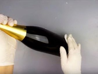 Изначально опускаем шампанское в теплую воду, чтобы размочить и избавиться от заводских наклеек (оставляет верхнюю этикетку, покрывающую горлышко);