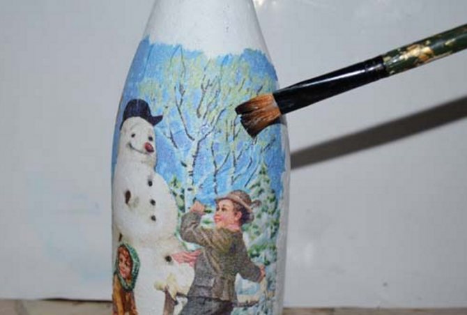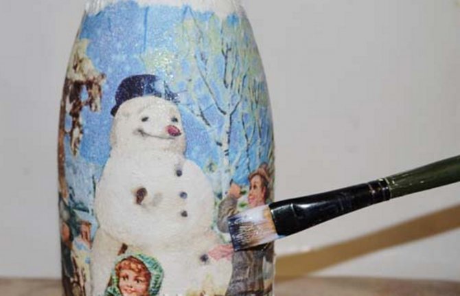Он позволяет при неровном наклеивании отрывать салфетку от бутылки, расправлять и приклеивать заново. При изготовлении аппликации из нескольких фрагментов важно, чтобы они не наклеивались друг на друга. Стоит безжалостно отрывать края рисунков, но делать поверхность однослойной. После высыхания наклеенной салфетки изображение покрывают декупажным клеем, но уже не спреем