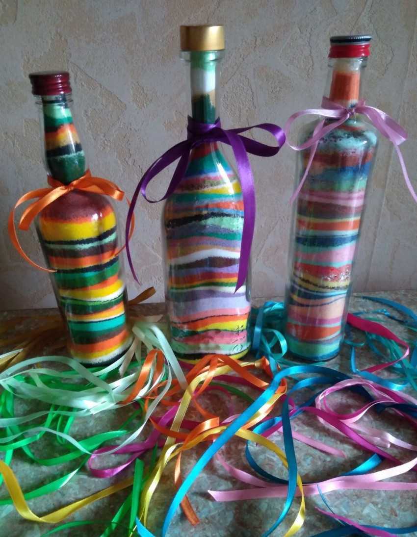 Важно не двигать бутылку и не давать смешаться цветам. Получается радужная частичка интерьера комнаты.