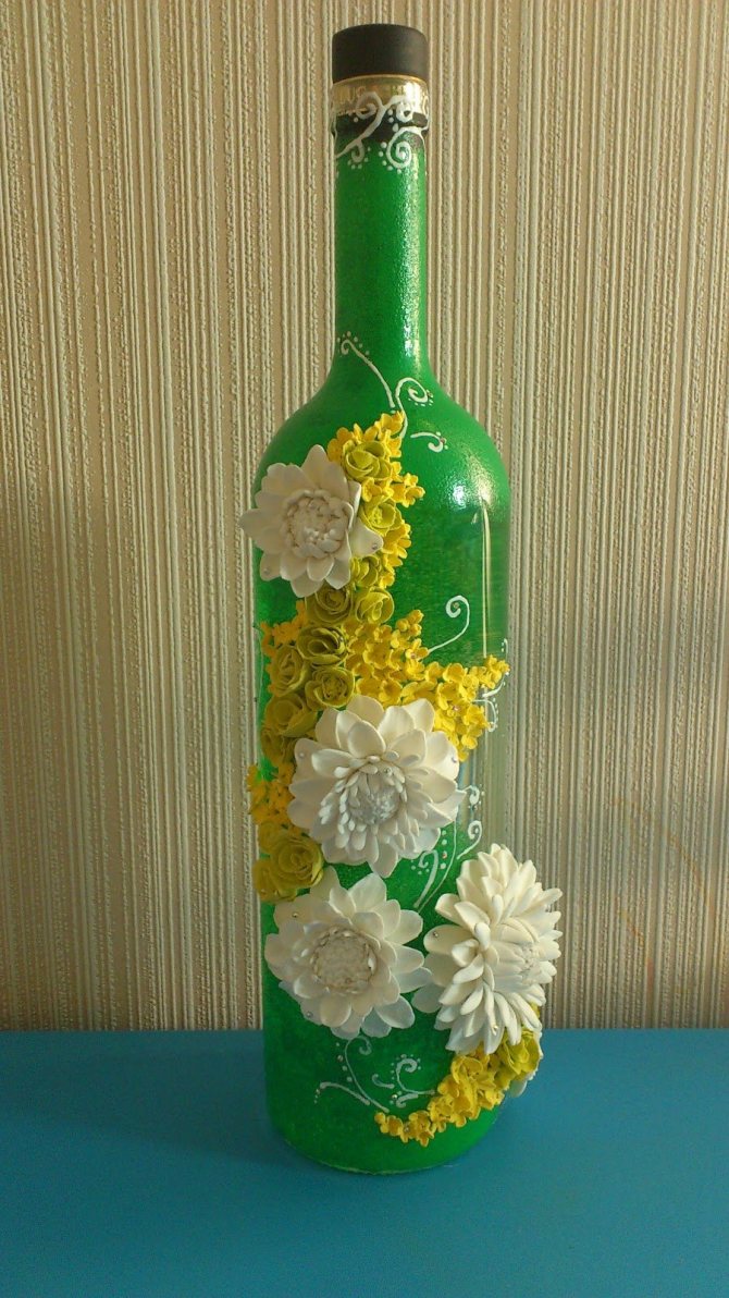 Бутылочку из-под игристого вина или шампанского можно украсить цветами из полимерной глины. Работа разделится на два этапа: