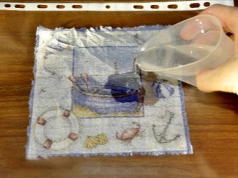 Фиксация рисунка феном или горячим утюгом возможна только после заблаговременного нанесения основного слоя на поверхность. Иллюстрацию аккуратно располагают на пергаменте, наносят на площадь и после закрепляют остывшее изображение лаком.
