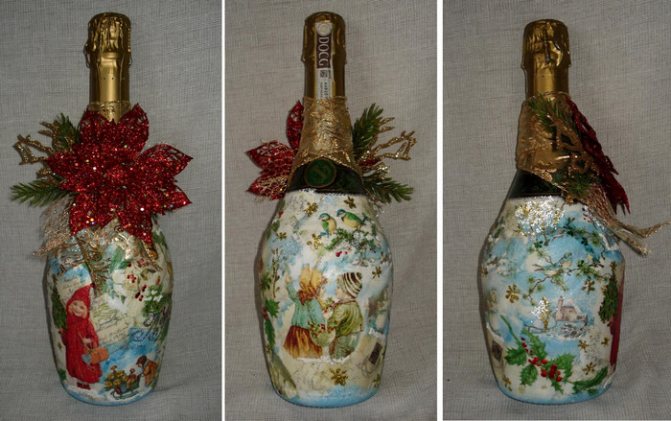 Приготовьтесь к неординарной подаче шипучки на праздничный стол. Раскупорить бутылку игристого и бодрящего напитка в стиле декупаж и просто так — не одно и тоже. Вдохнуть в вещь «вторую» жизнь — в этом и состоит изюминка техники «декупаж». Слово французское, но придумали украшать домашнюю утварь еще в далеком Средневековье, причем в Германии. Сегодня старинная техника принимает невиданные размахи: ею «заражаются» люди всех возрастов. Оригинальное оформление выражено в разных стилях: от прованс до милитари и этно. Уверены, что вы не устоите, чтобы не попробовать декор шампанского к Новому году, когда все дарят друг другу подарки. ВАШ может стать самым оригинальным, новогодним и искренним!