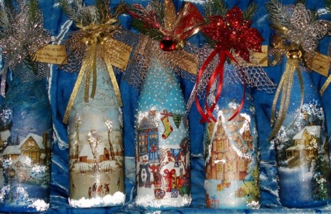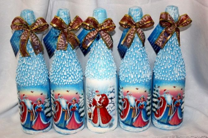Оформление бутылок к Новому году может быть совершенно разным и зависит только от фантазии мастера. Например, подобрав салфетки с рисунками на красивом голубом фоне, окрасив оставшуюся часть бутылки в такой же красивый «зимний» оттенок и дополнив все белоснежными деталями, получится очень стильное, как будто ледяное украшение. Мятая бумага позволит сделать некоторые части изображения объемными: бороду Санта-Клауса, опушку его костюмчика и снег под ногами.