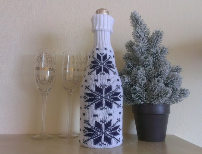 - Сшиваем детали и получаем «костюмчики» для шампанского. Одеваем их на бутылки;