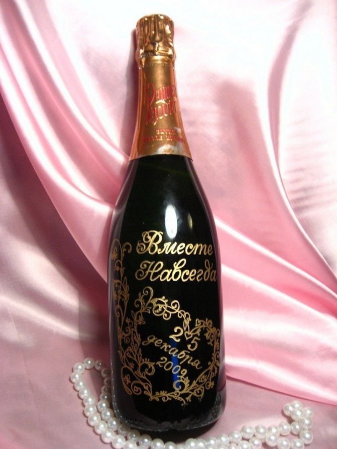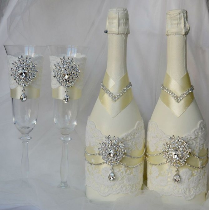 Теперь осталось выбрать оформление для вашего шампанского. Вариантов множество – нежное кружево, бусинки, фигурки из полимерной глины, живые цветы. Ниже приведены два наиболее лёгких мастер-класса, которые позволяют создать маленькие шедевры своими руками.
