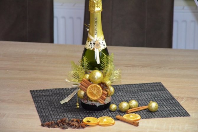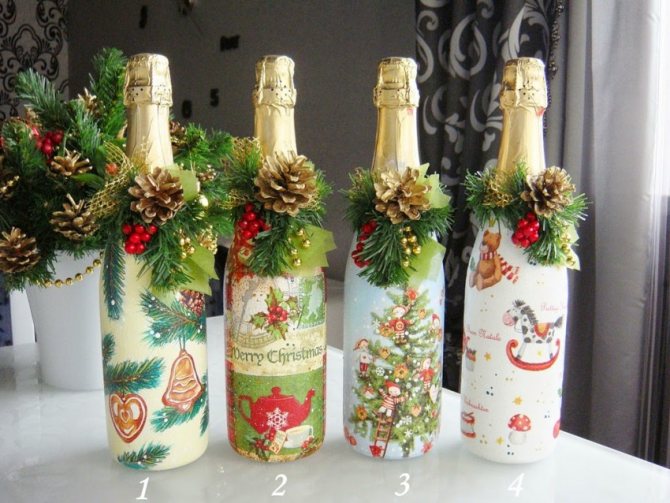 Новогодние бутыли станут настоящим произведением искусства, если дополнительно украсить их искусственными еловыми ветвями и ягодами или же полноценными искусственными флористическими композициями с игрушками, шариками и шишками.