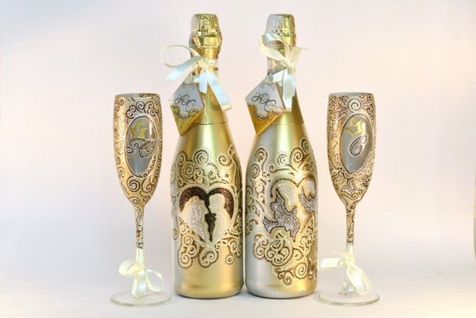 Бокалы украшаются по тому же принципу, что и бутылки. Рекомендуется связать лентами два бокала или две бутылки как символ прочных отношений.