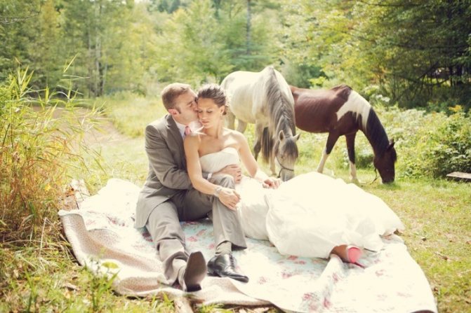 - Животные в кадре. Все большую популярность набирают фотосессии, в которых в кадре учувствуют птицы и животные. Лошади, например, благодаря их природной грациозности и красоте, сделают снимки трогательными. А если молодые не побоятся сесть в седло, кадр, в котором влюбленная пара вдвоем верхом на лошади, будет по-настоящему романтичным.